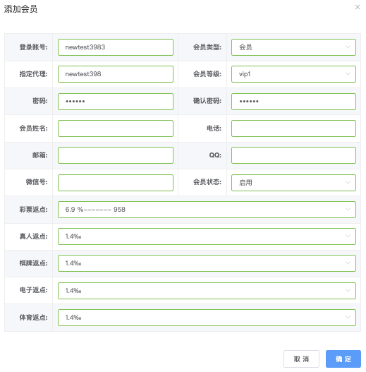 登陆帐号、会员类型(会员、代理)下拉选择、密码、确认密码、(彩票返点、真人返点、棋牌返点、电子反点、体育反点)依照规定填下拉选择。