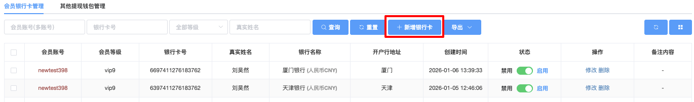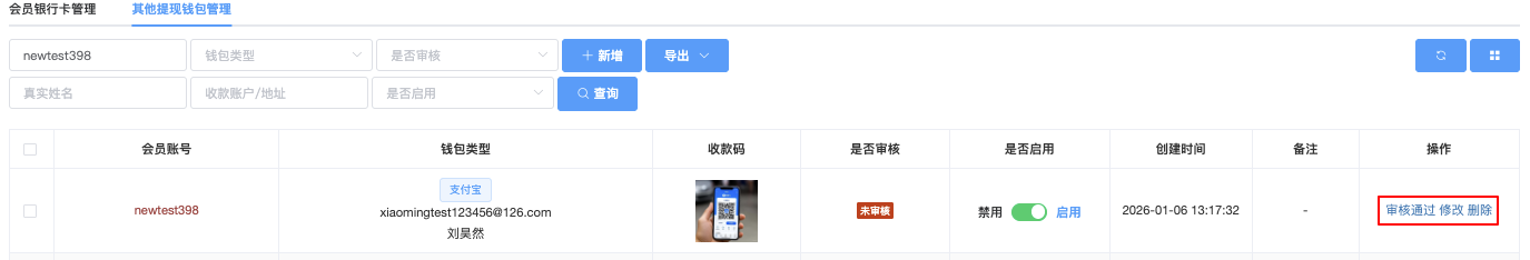 - 会员帐号:输入要查询的具体会员帐号(如 newtest3984),用于精确查询。