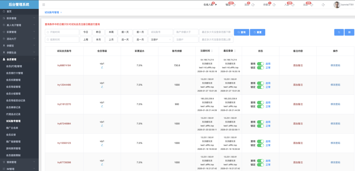 用于创建、查看、维护和控制试玩账号的状态。这些账号供新用户测试平台游戏、界面,不涉及真实资金充值/提现,但可模拟投注、查看赔率等。