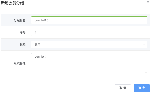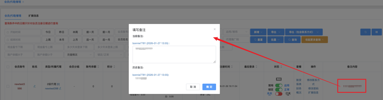 - 「系统备注」栏位:点击该列会员「添加系统备注」,跳出「填写系统备注」弹窗,输入字串完毕后,点击「确定」即可保存。