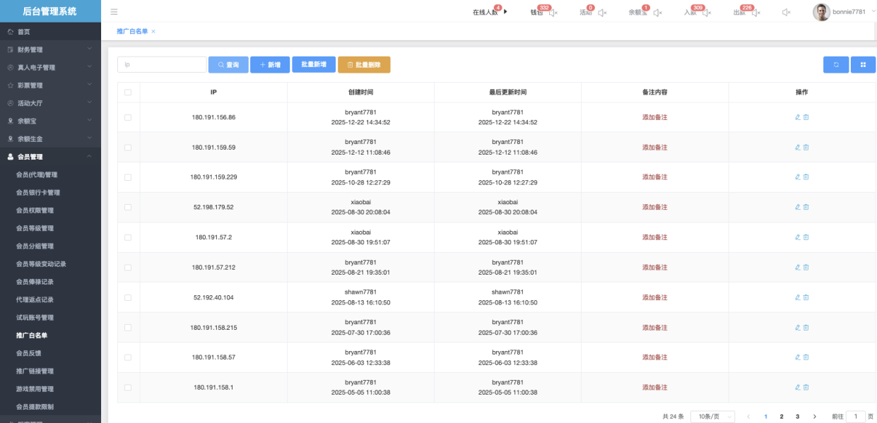 用于维护和管理允许参与推广活动、链接分享或享受特殊权限的IP地址列表,防止风控误判或限制正常推广行为。