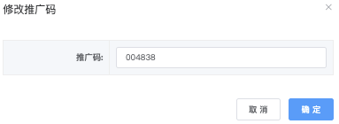 」弹出「修改推广码」进行编辑,完成后点击「确定」即可完成保存 - 「状态」栏位:禁用(红色) / 启用(绿色)