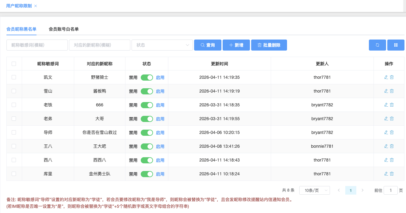 会员匿称黑名单