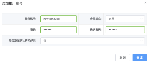 登陆帐号、会员状态(启用 / 禁用)下拉选择*默认启用、密码、确认密码、是否添加默认群和好友(是 / 否)下拉选择