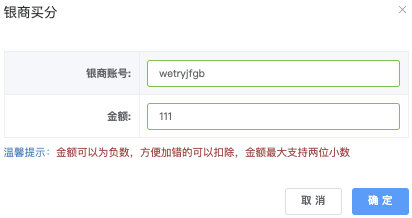 - 「银商买分」:点击后跳出「银商买分」,输入金额后点击「确认」即可完成买分。