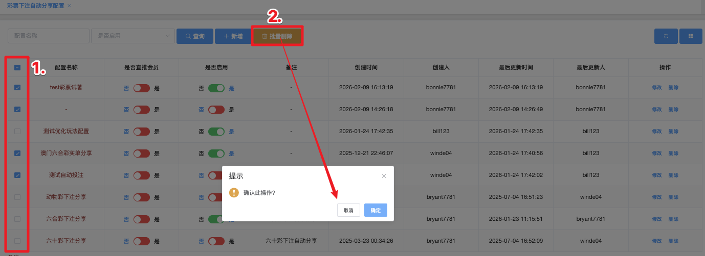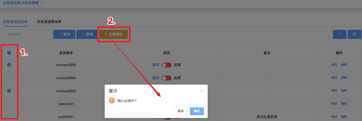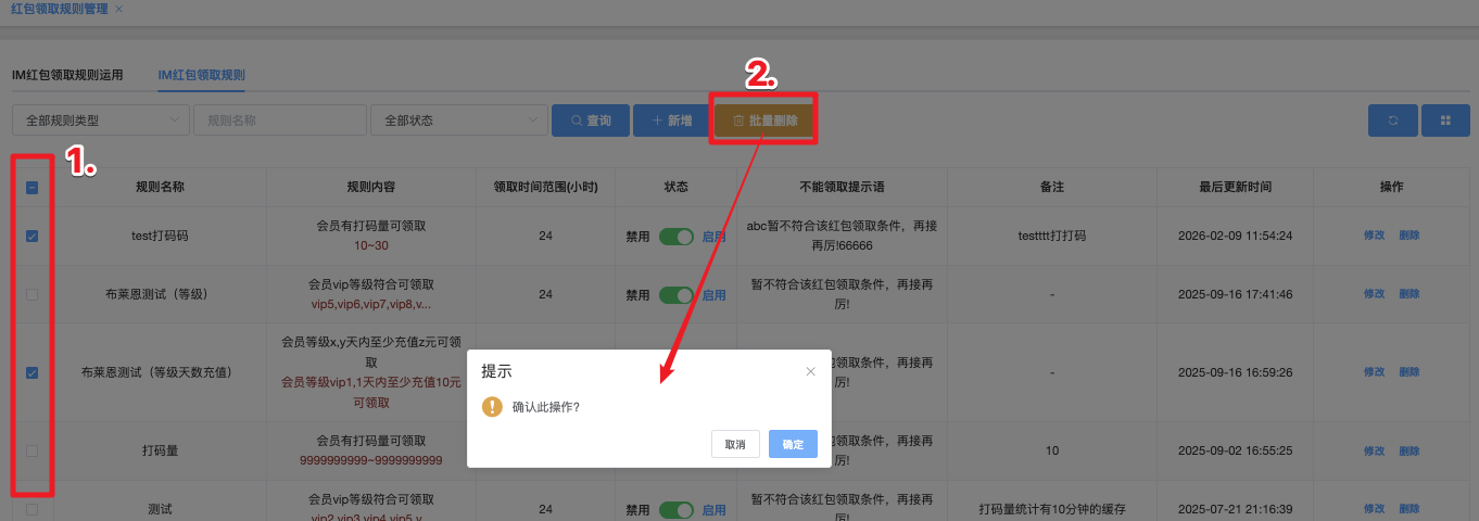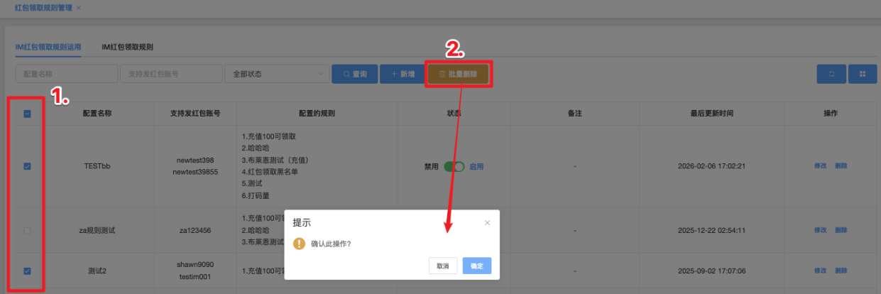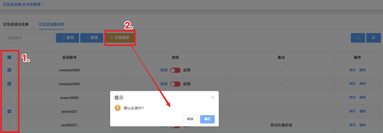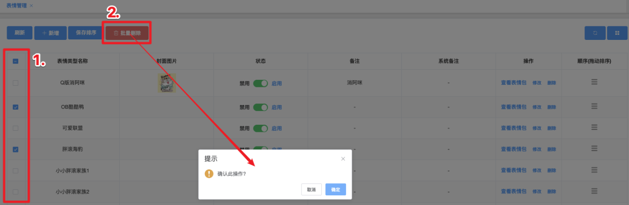 - 点击「批量删除」按钮,系统弹出确认窗口,显示:确认此操作?