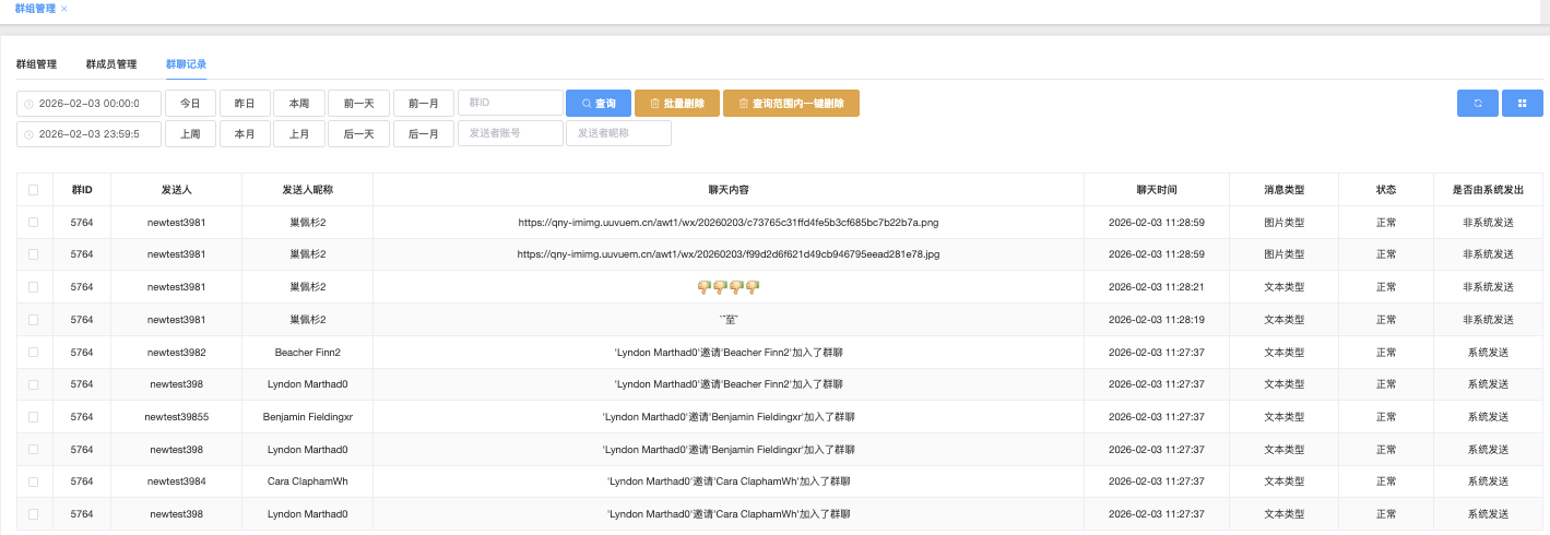 - 全部状态:(下拉▼)正常、已被群主移除、自己退出、群已被群主解散、群已被系统解散、已被系统移除、已被系统清理