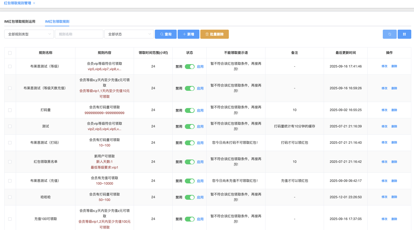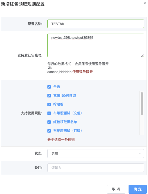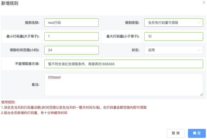 - 规则类型:(下拉▼)会员有充值可领取、会员vip等级符合可领取、下级有首充可领取、下级有充值可领取、新用户可领取、会员等级x.y天内至少充值z元可领取、会员有打码量可领取