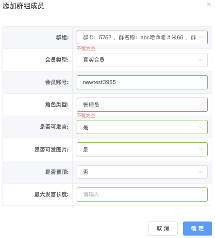 - 角色类型 :(下拉▼)群主 / 管理员 / 普通成员,未选择默认全部角色
