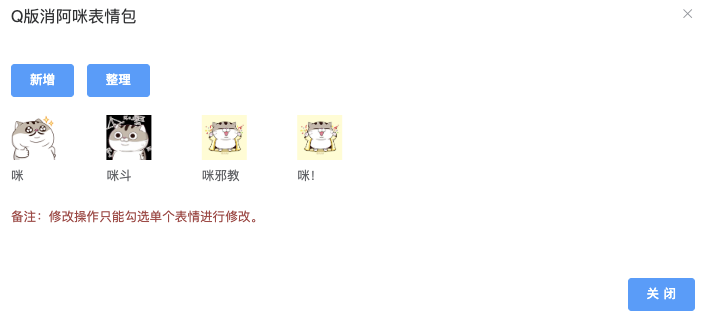 - 「查看表情包」:点击后跳出弹窗可点击「新增」或「整理」