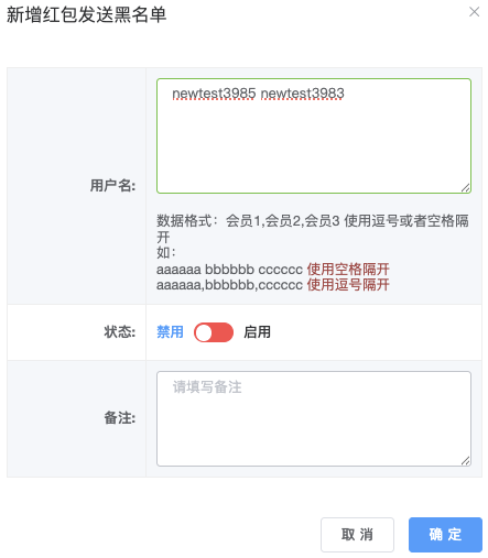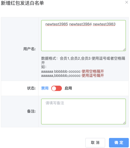 - 备注:管理员内部记录用,不能为空,限200字。