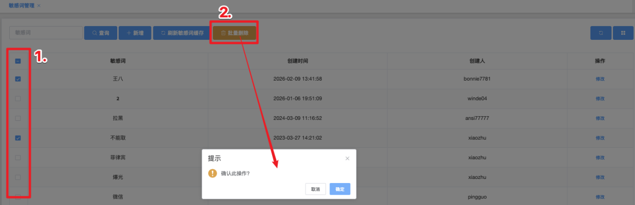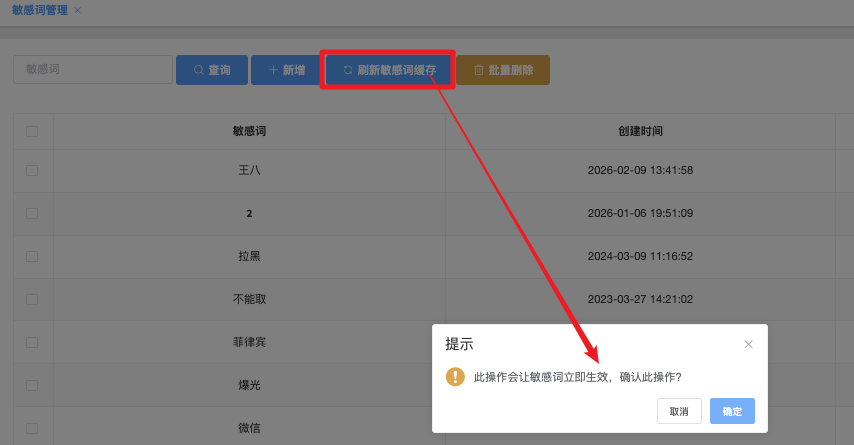 点击后系统弹出提示「此操作会让敏感词立即生效,确认此操作?」,点击确定即可生效当前敏感词。