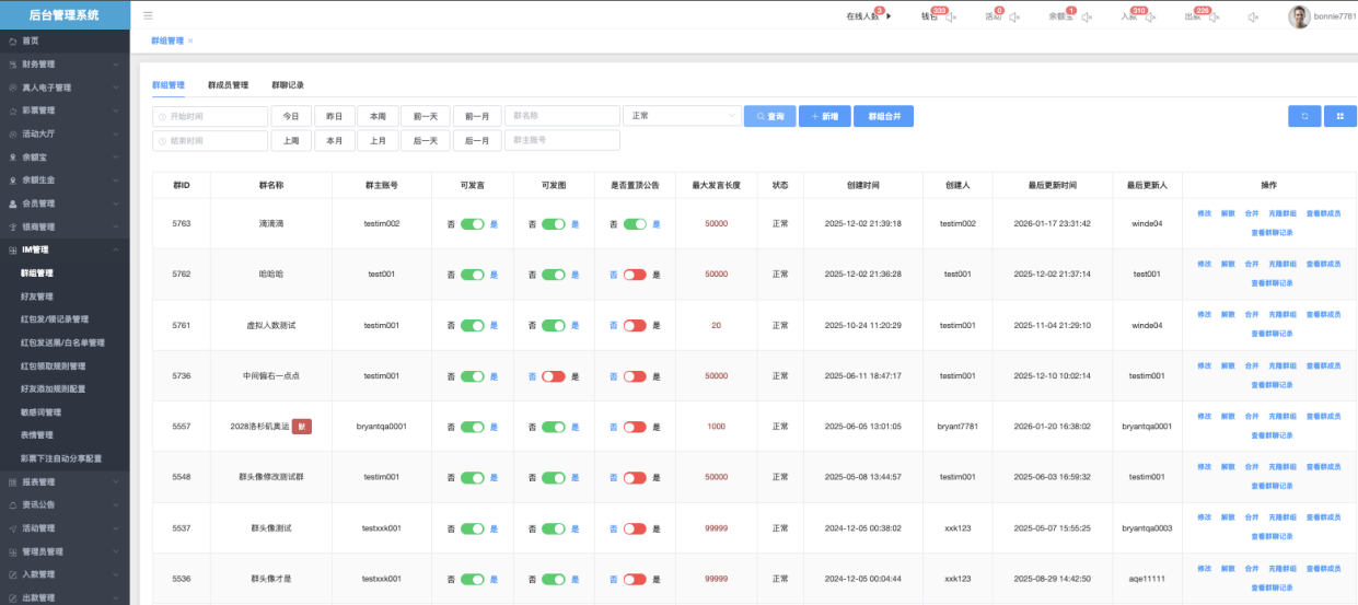 - 群主账号:必填,指定哪个账号作为群主(如 newtest398)。