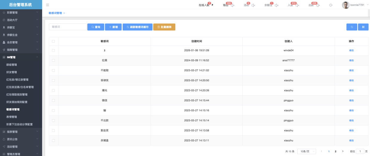 用于维护平台内(主要是聊天、群消息、昵称、红包备注、评论等IM相关场景)的违禁/敏感/营销/风险词汇管理