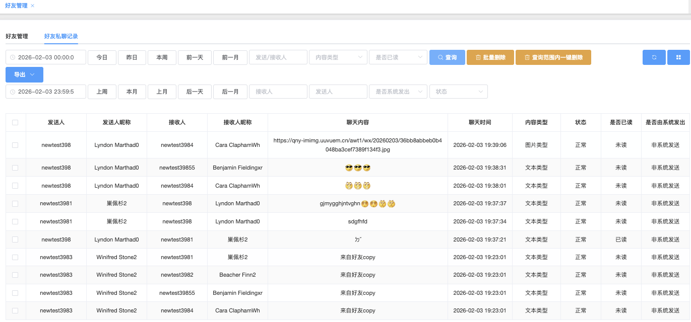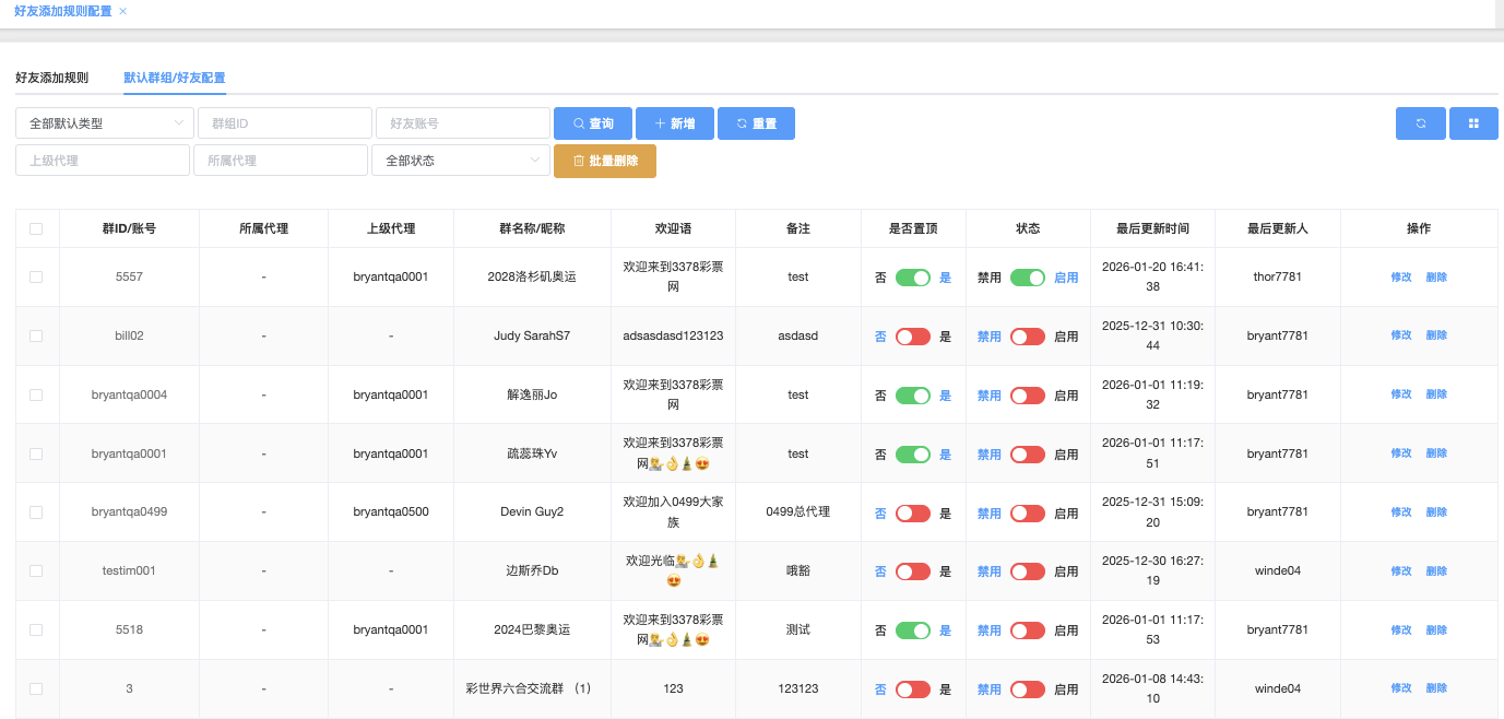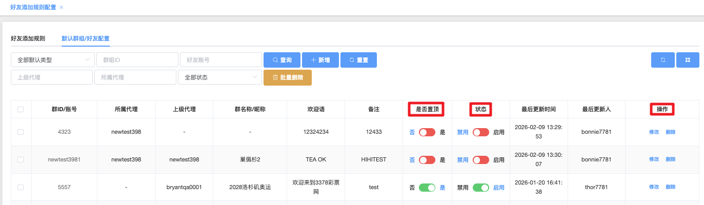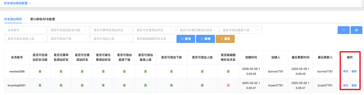 - 是否可以被任意添加为好友:下拉▼ 是 / 否(默认全部)