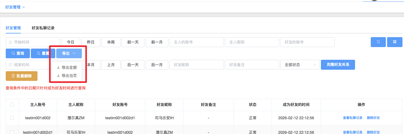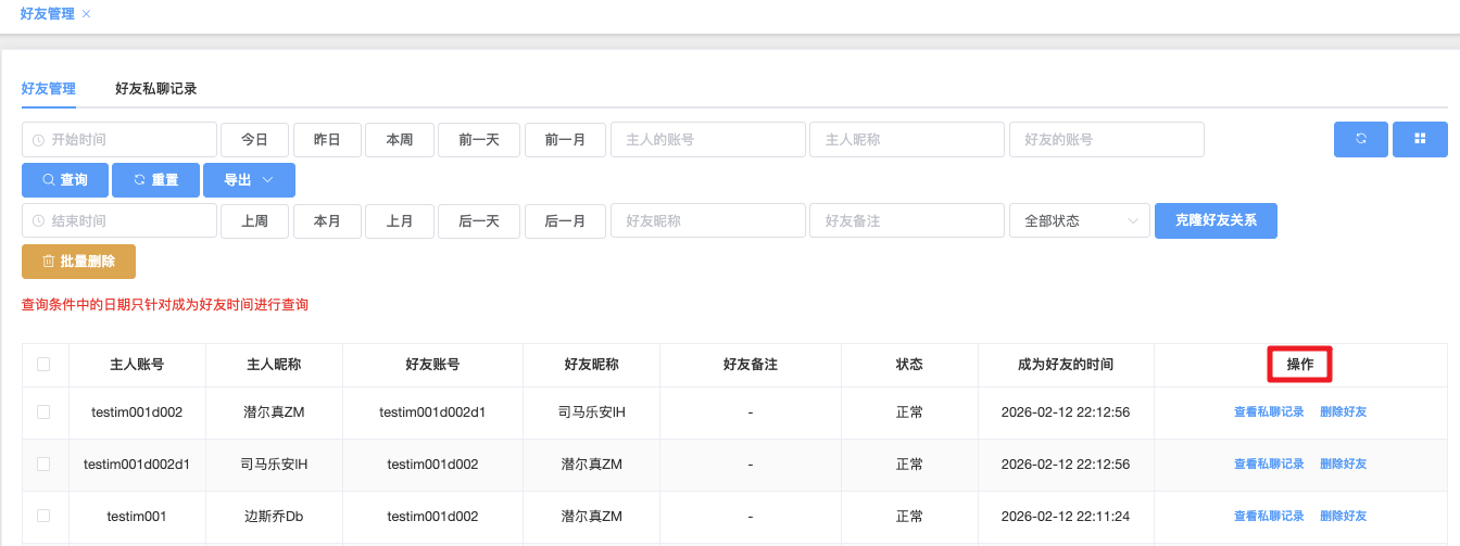 - 是否能被删除好友关系:下拉▼ 是 / 否(默认全部)