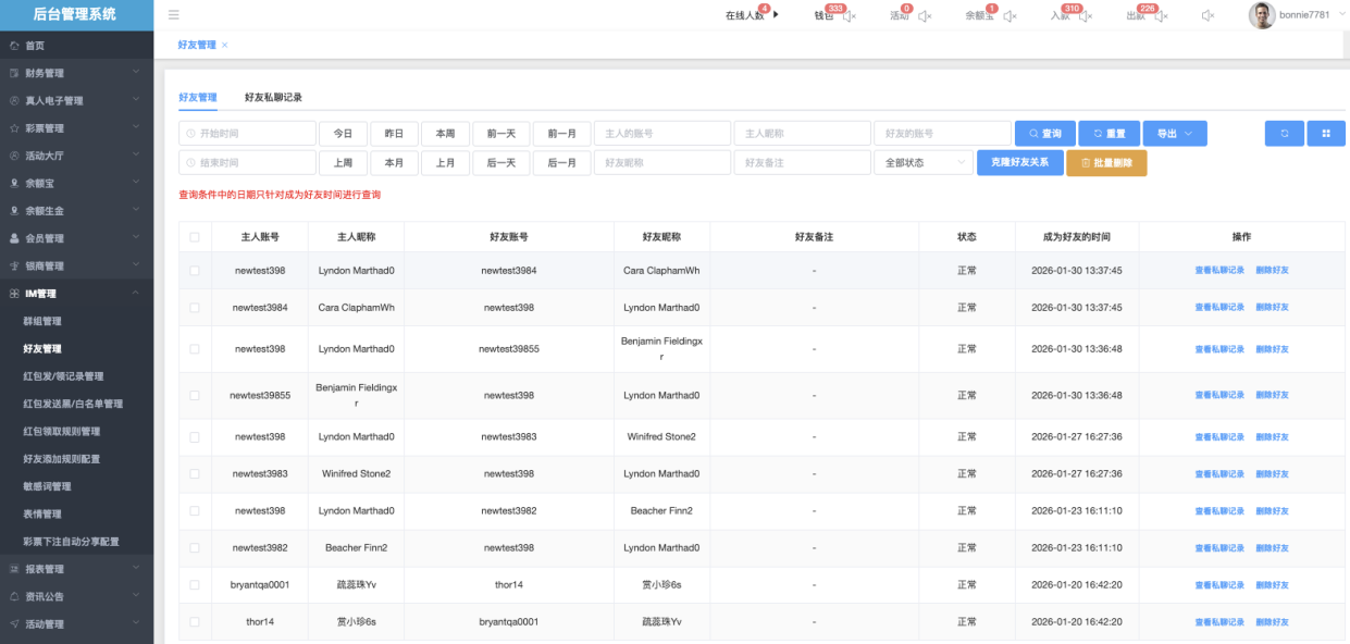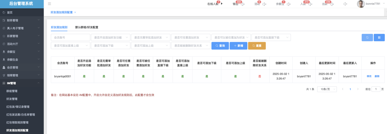 - 是否可任意添加好友:下拉▼ 是 / 否(默认全部)