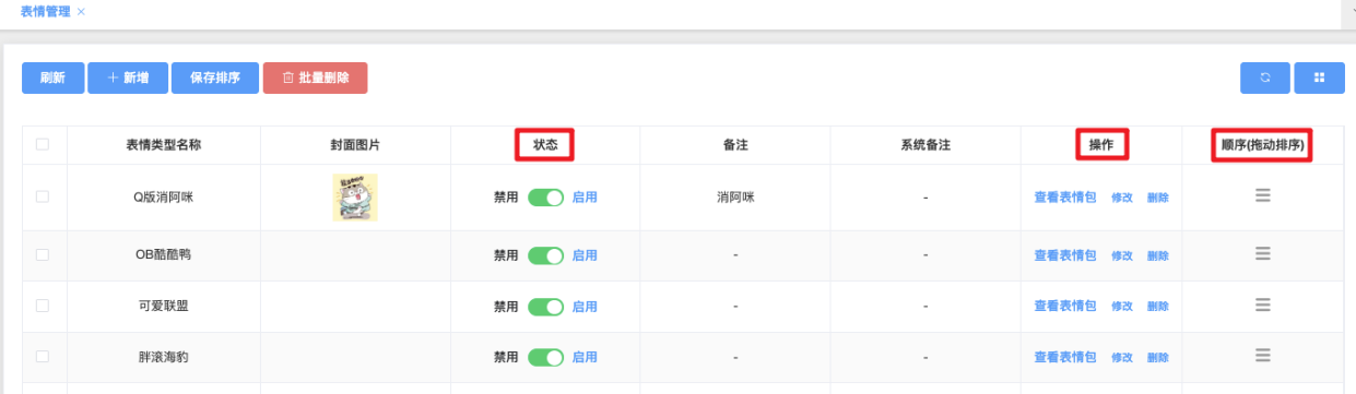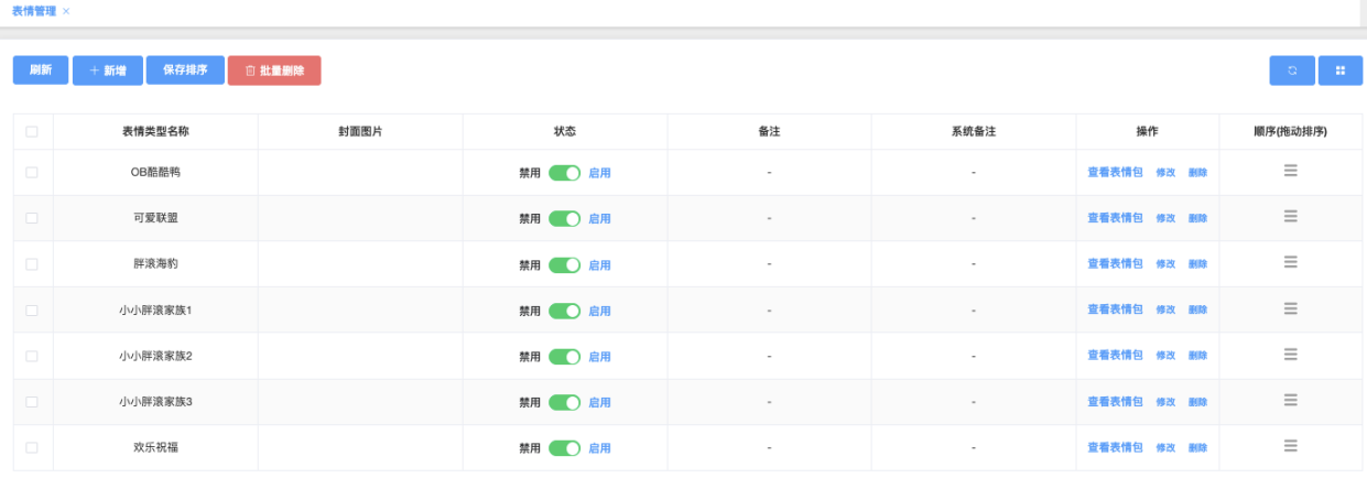 页面查看、创建、编辑、启用/禁用、排序及删除各个表情包分类。每个分类对应用户聊天表情面板中的一个独立分组(如“OB酷鸭”“胖浪海豹”),并可进一步管理该分类下的具体表情图片。