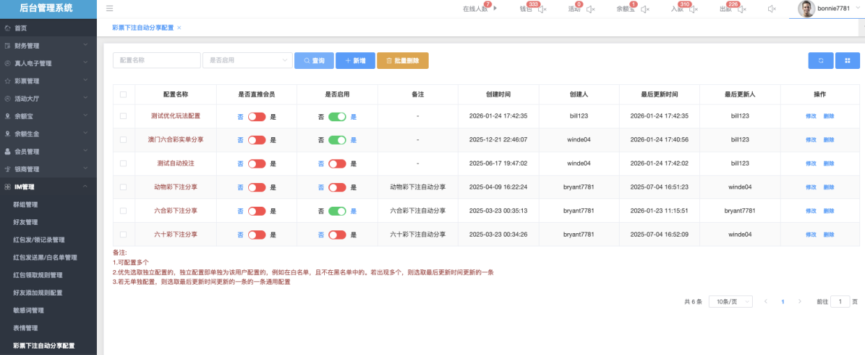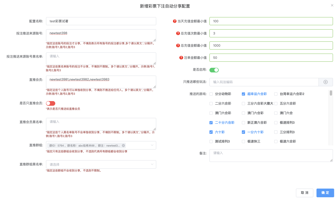 - 推送的游戏:支持多选,如 六合彩、超幸运六合彩、澳门六合 等。只这些玩法下注才触发分享。