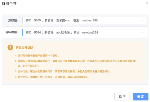 点击后弹出「群组合并」将选择好「目标群组」(为合并过去的群组)确认后点击确认几可完成合并。