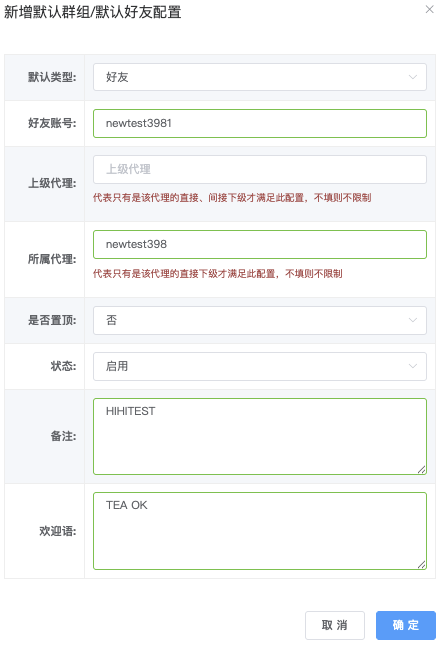 」后跳出弹窗「新增默认群组/默认好友配置」,依序填写