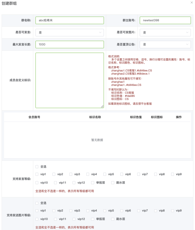 - 支持发言等级:(复选框)全选、vip1~vip12、举报层、刷水层 等,勾选后只有这些等级的成员才能发言