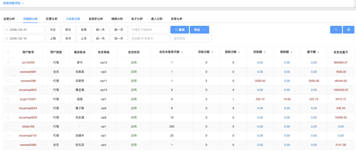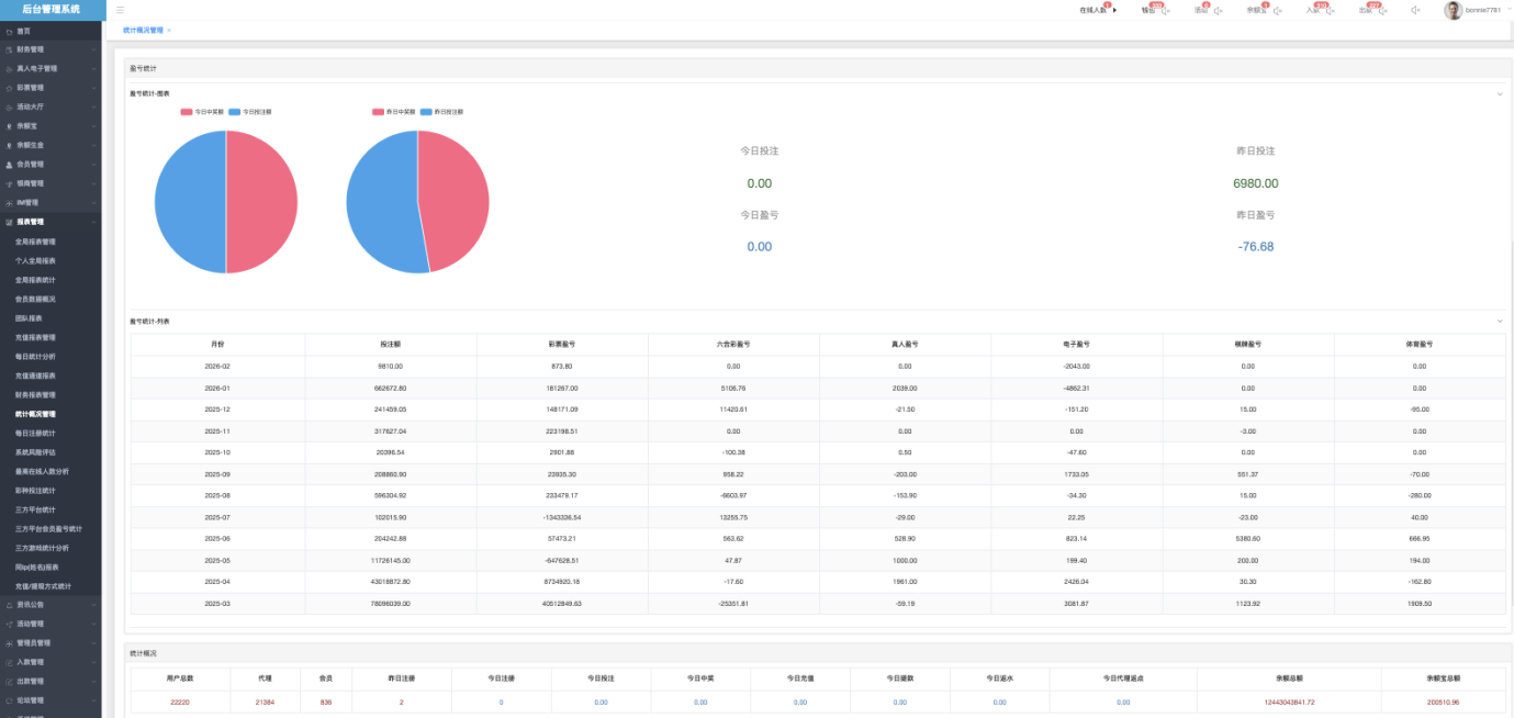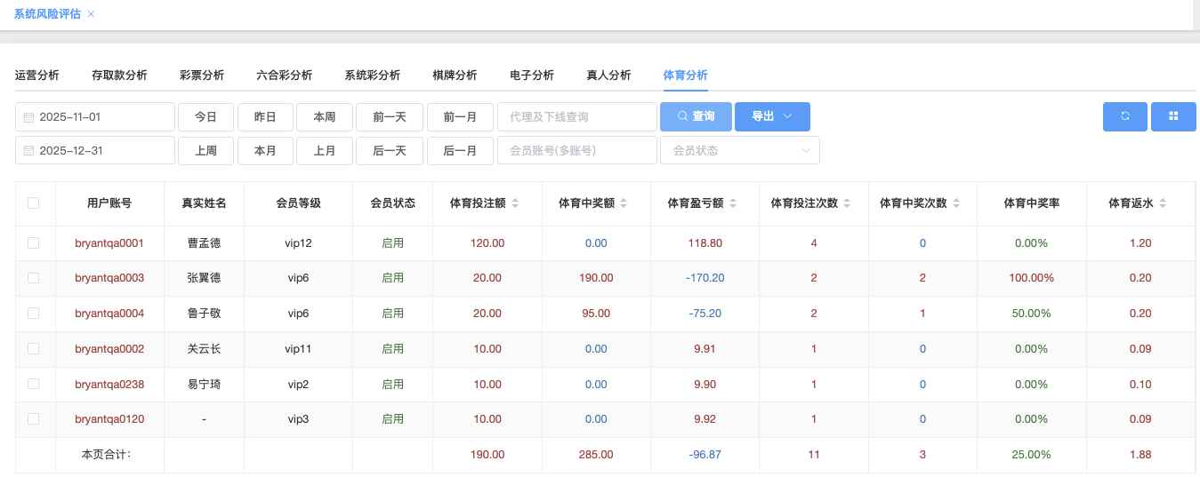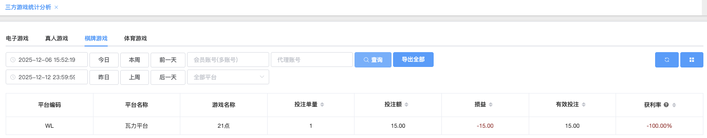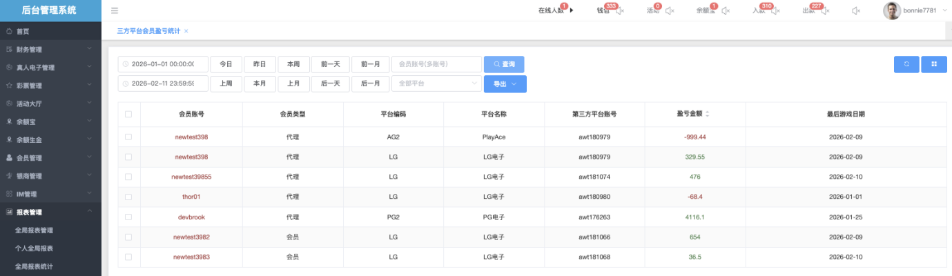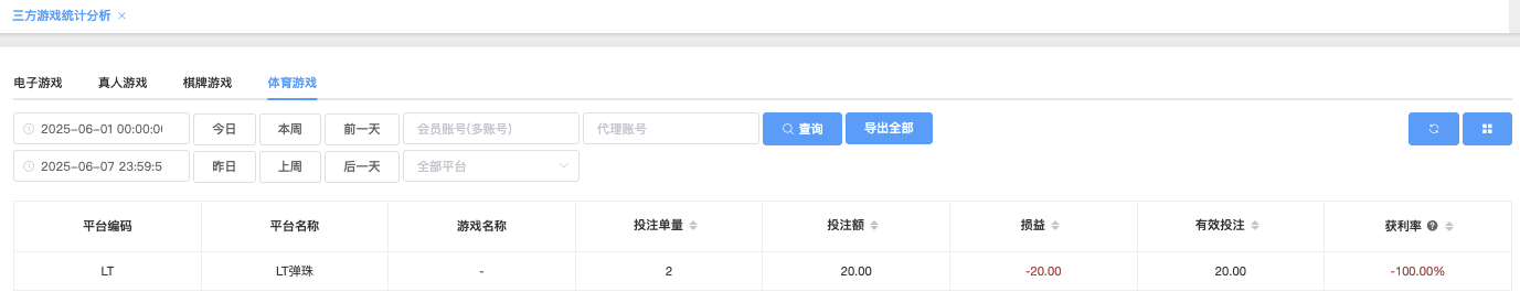 - 盈亏金额:该会员在该平台累计净盈亏(负数=会员输钱→平台盈利,正数=会员赢钱→平台亏损)
