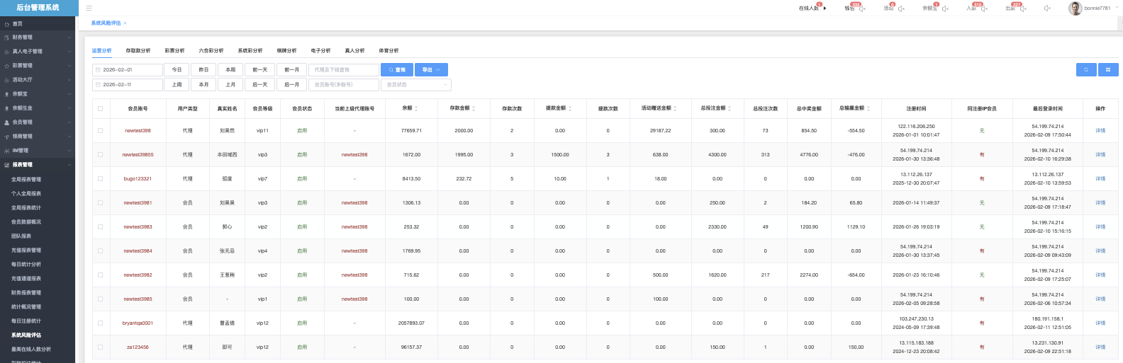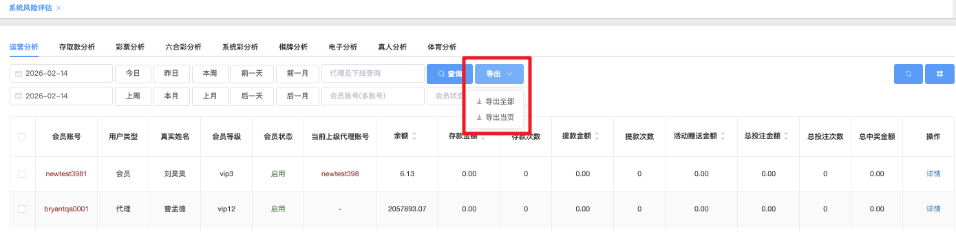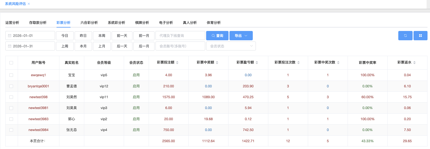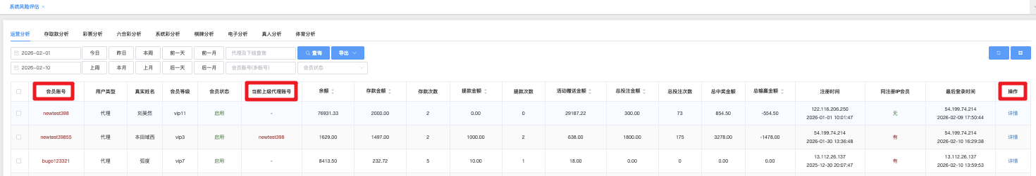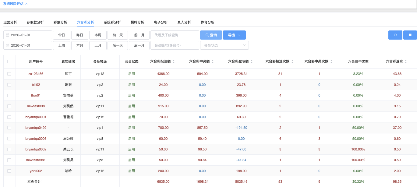 - 盈亏金额:该会员在该平台累计净盈亏(负数=会员输钱→平台盈利,正数=会员赢钱→平台亏损)