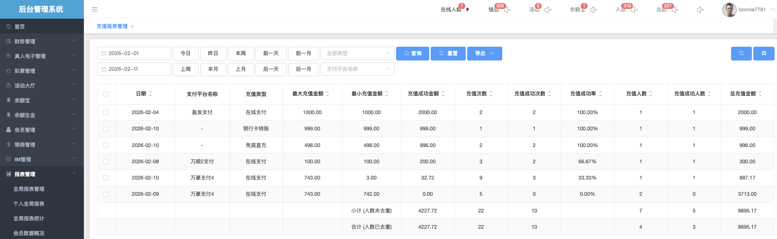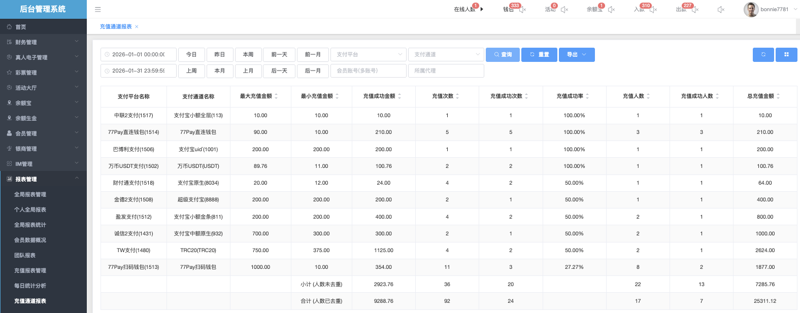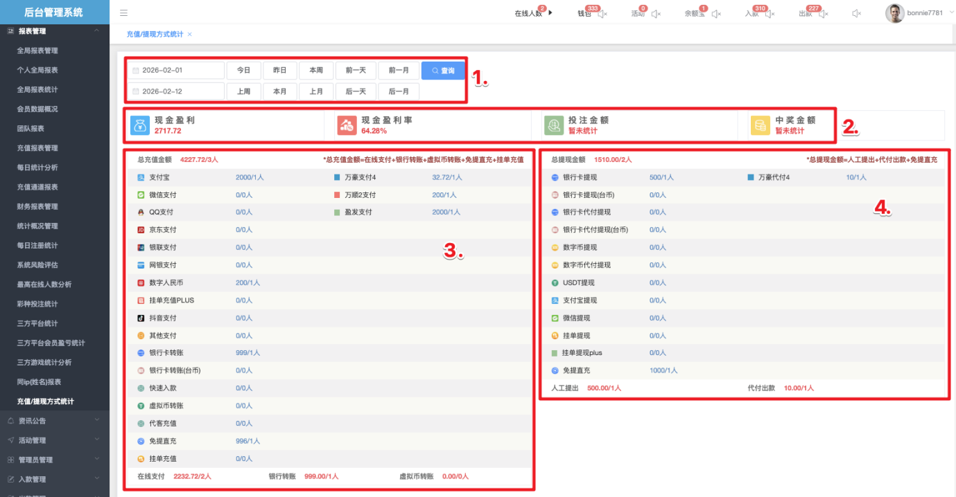 - 左侧 → 充值方式明细(各种支付渠道的充值金额、人数、占比)