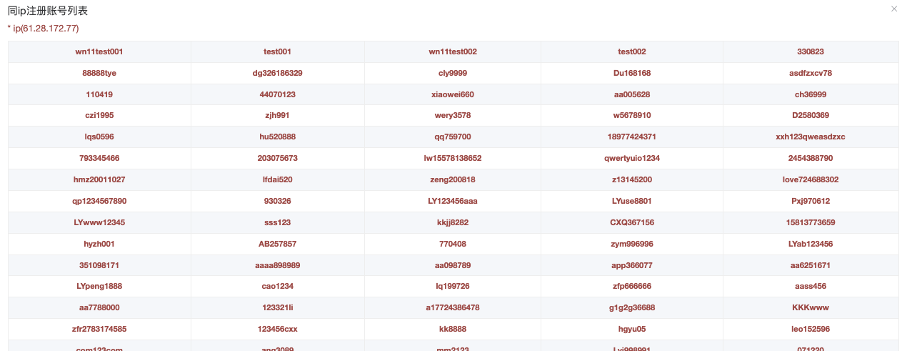 - 「查看详情」点击后弹出「同ip注册账号列表」可详细查看此ip中全数用户帐号。