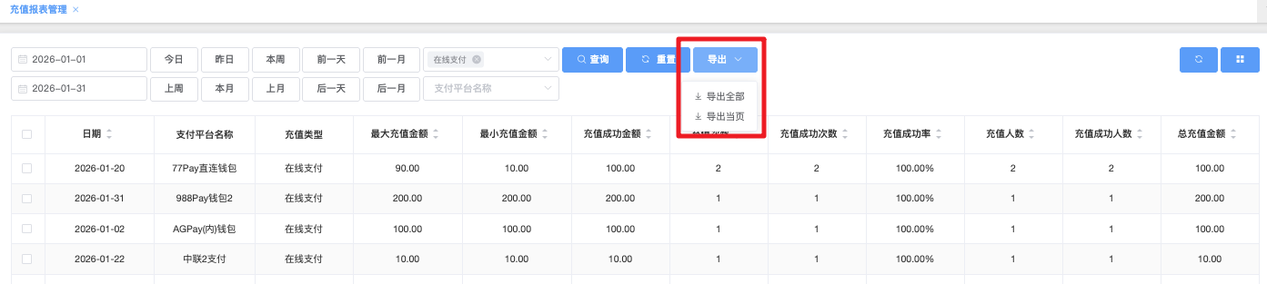- 导出全部 → 导出符合当前筛选条件的全部数据