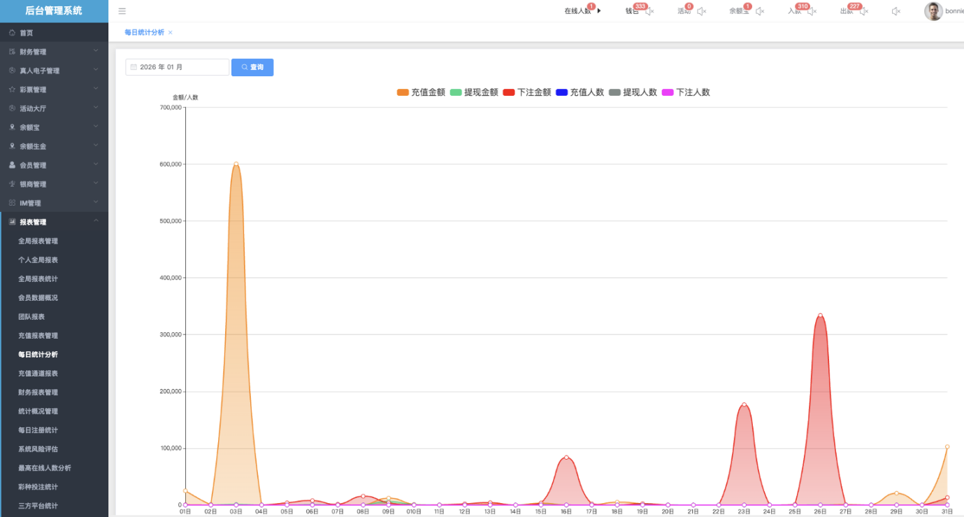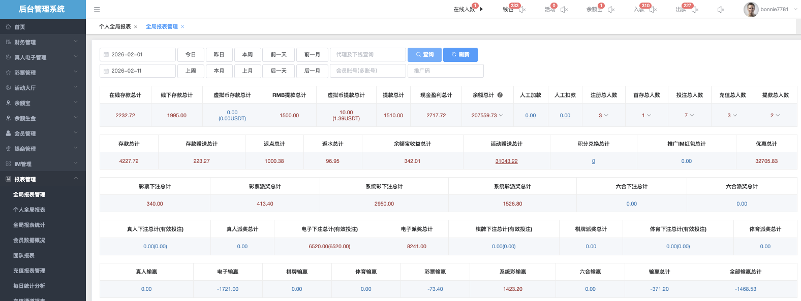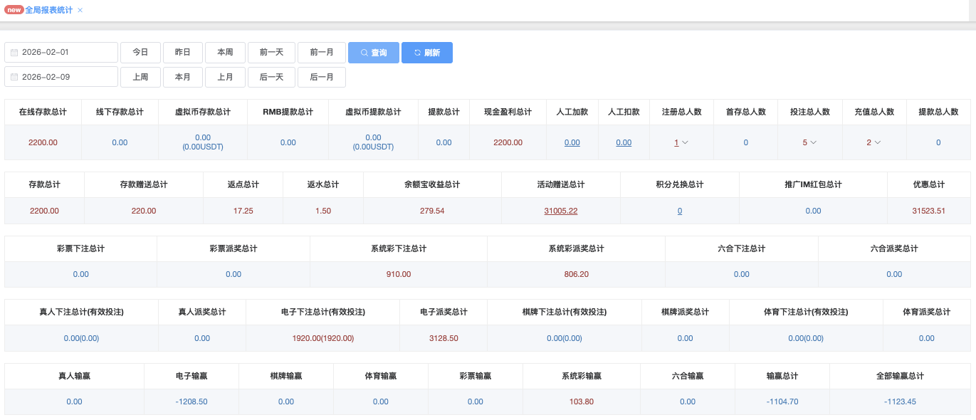 全局报表管理页面是平台财务、投注、盈亏、用户行为的全景汇总报表
