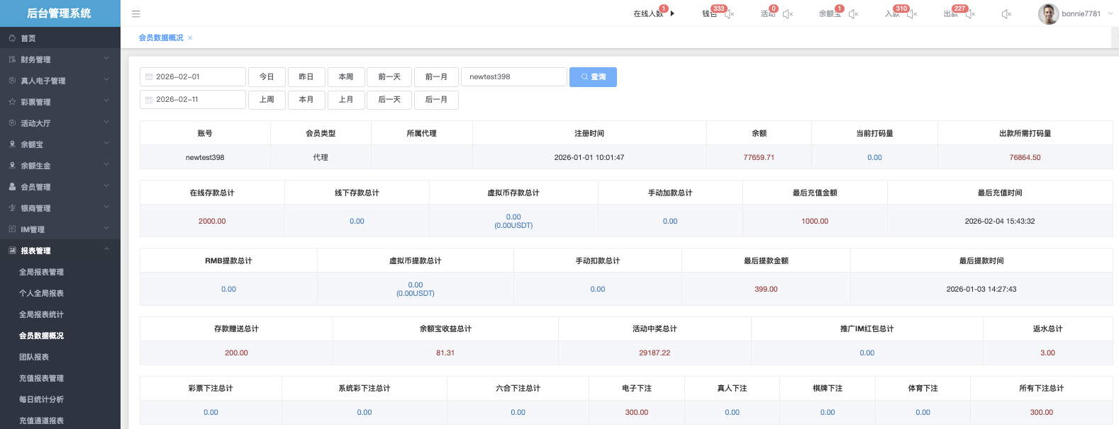 - 单用户查询:输入具体会员账号,单一查询该会员的数据。