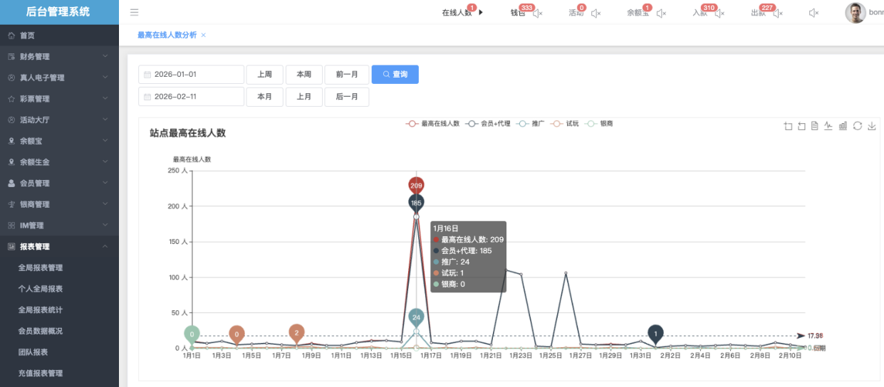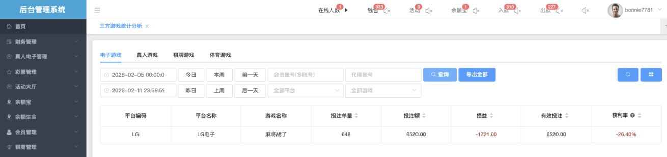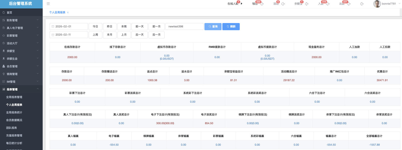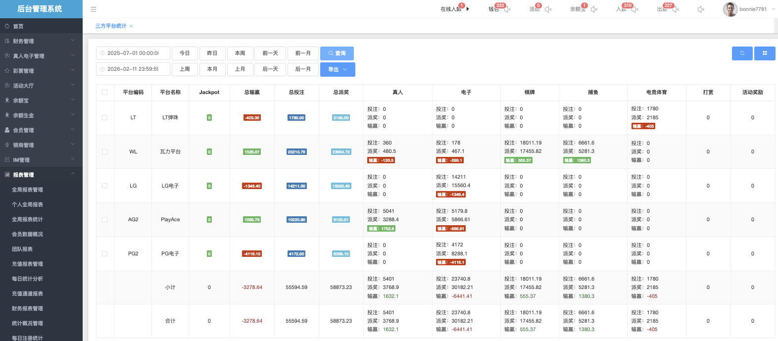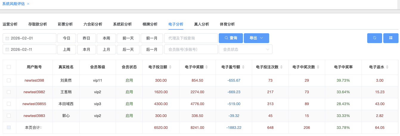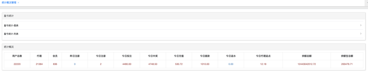 - 真人输赢 / 电子输赢 / 棋牌输赢 / 体育输赢 / 彩票输赢 / 系统彩输赢 / 六合输赢 / 输赢总计 / 全部输赢总计(负数表示平台盈利,正数表示平台亏)