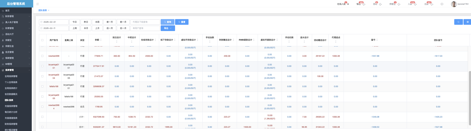 - 投注总计:该用户及其下线团队所有游戏的总投注金额