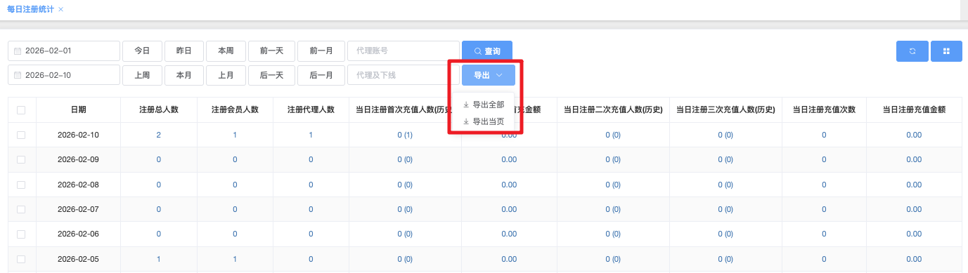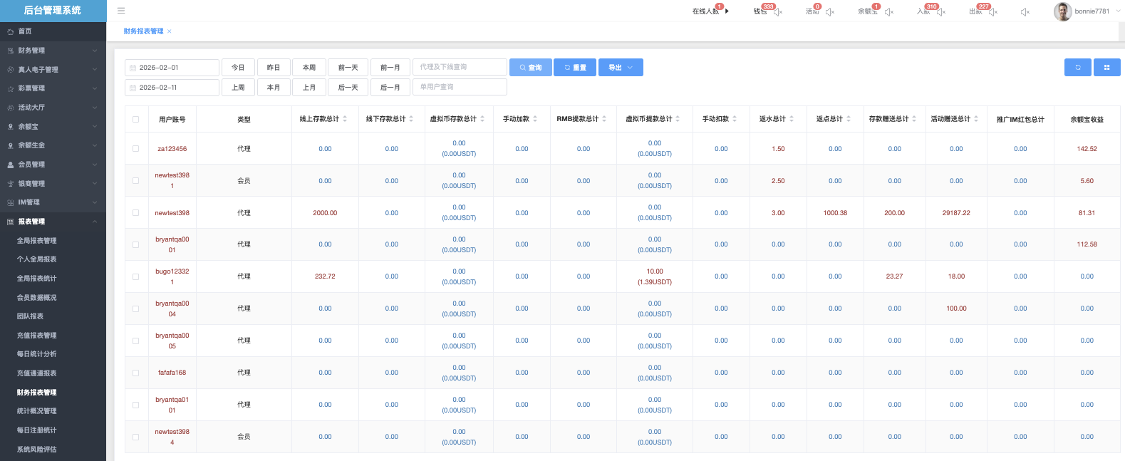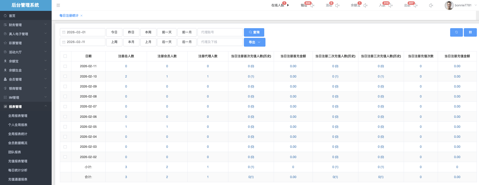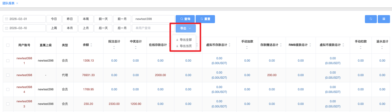 - 代理及下线查询:输入代理账号,只统计该代理及其所有下线的汇总数据。