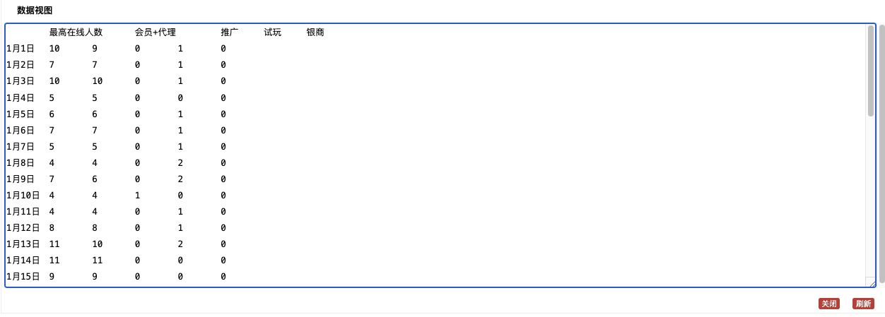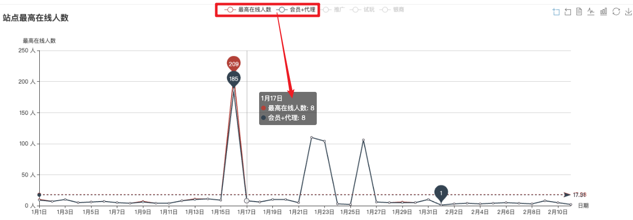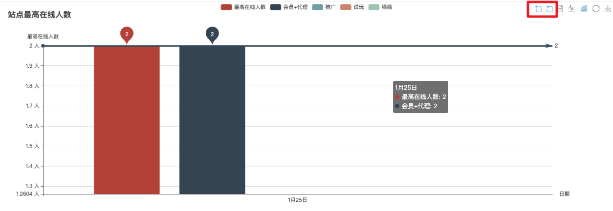 切换操作:可选择当前要查看的数据视图(如图下 选择 最高再现人数、会员+代理)