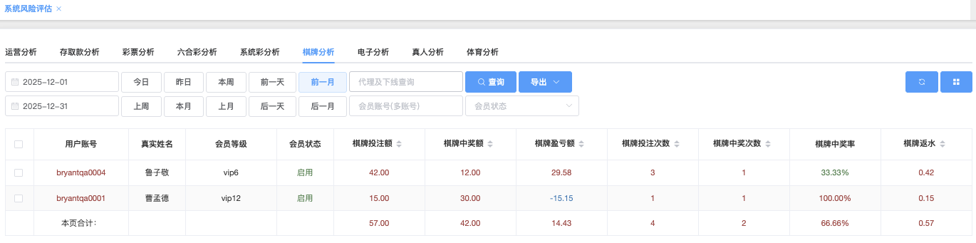 - 棋牌下注总计(有效投注) / 棋牌派奖总计