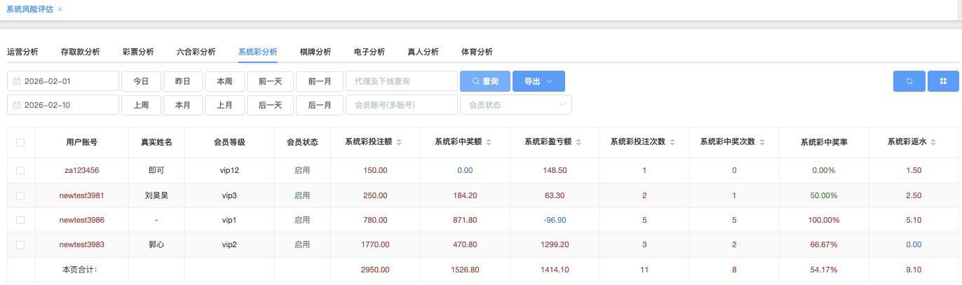 - 总输赢:平台净盈亏(负数=平台盈利,正数=平台亏损)