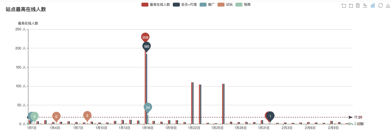 将鼠标指针移动到任意数据点位置时,自动弹出浮动提示框,显示该日期的精确最高在线人数及相关细分数据