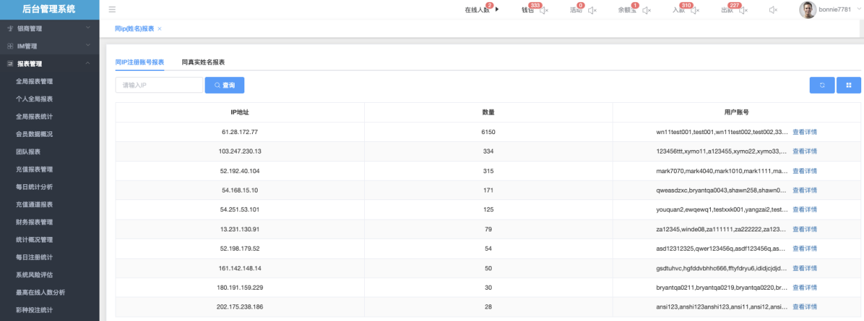 同IP(姓名)报表页面是平台风控与反作弊的核心工具,用于统计和展示使用相同IP地址注册/登录或使用相同真实姓名的账号集合