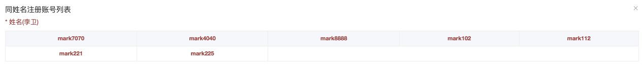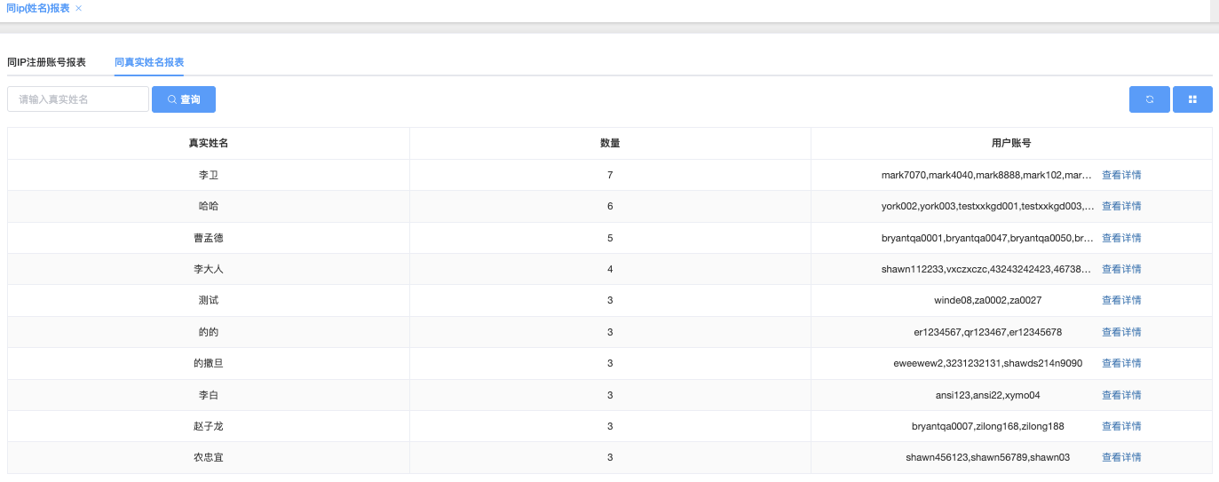 - 「查看详情」点击后弹出「同姓名注册账号列表」可详细查看此真实姓名全数用户帐号。