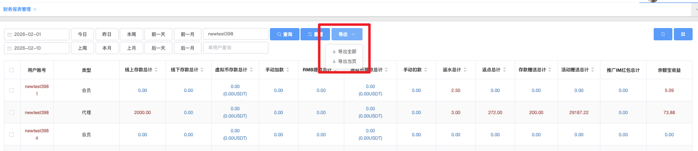 - 用户账号:会员或代理的唯一ID(如 newtest398、newtest3981、newtest39855)
