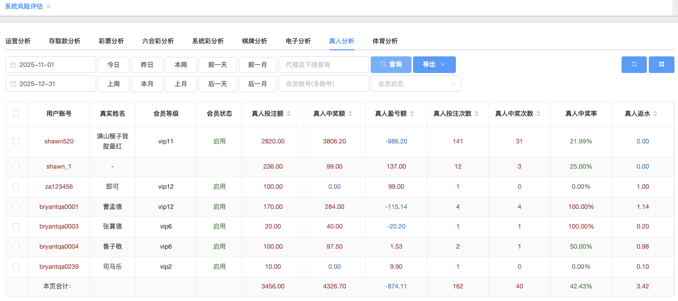 - 输赢:真人模块净盈亏(绿色=盈利,红色=亏损)