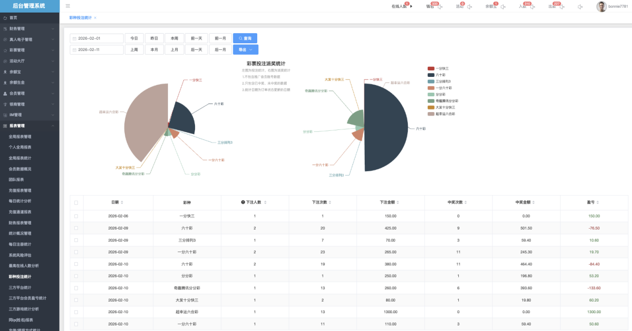 - 盈亏:该日该彩种的净盈亏(下注金额 - 中奖金额,负数=平台盈利)