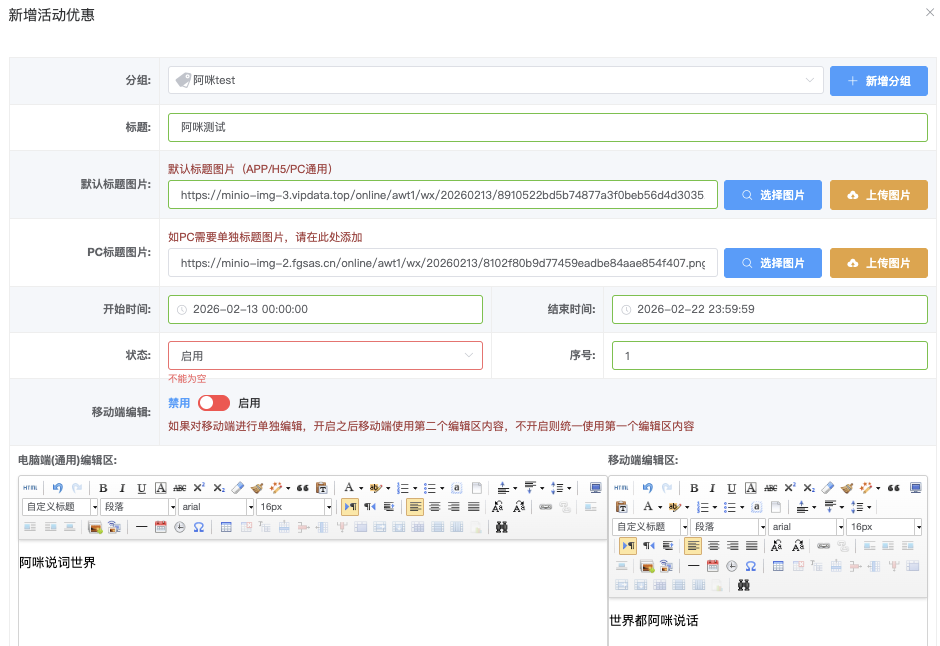 - 启用:移动端显示第二个编辑器内容,禁用:移动端统一使用电脑端内容