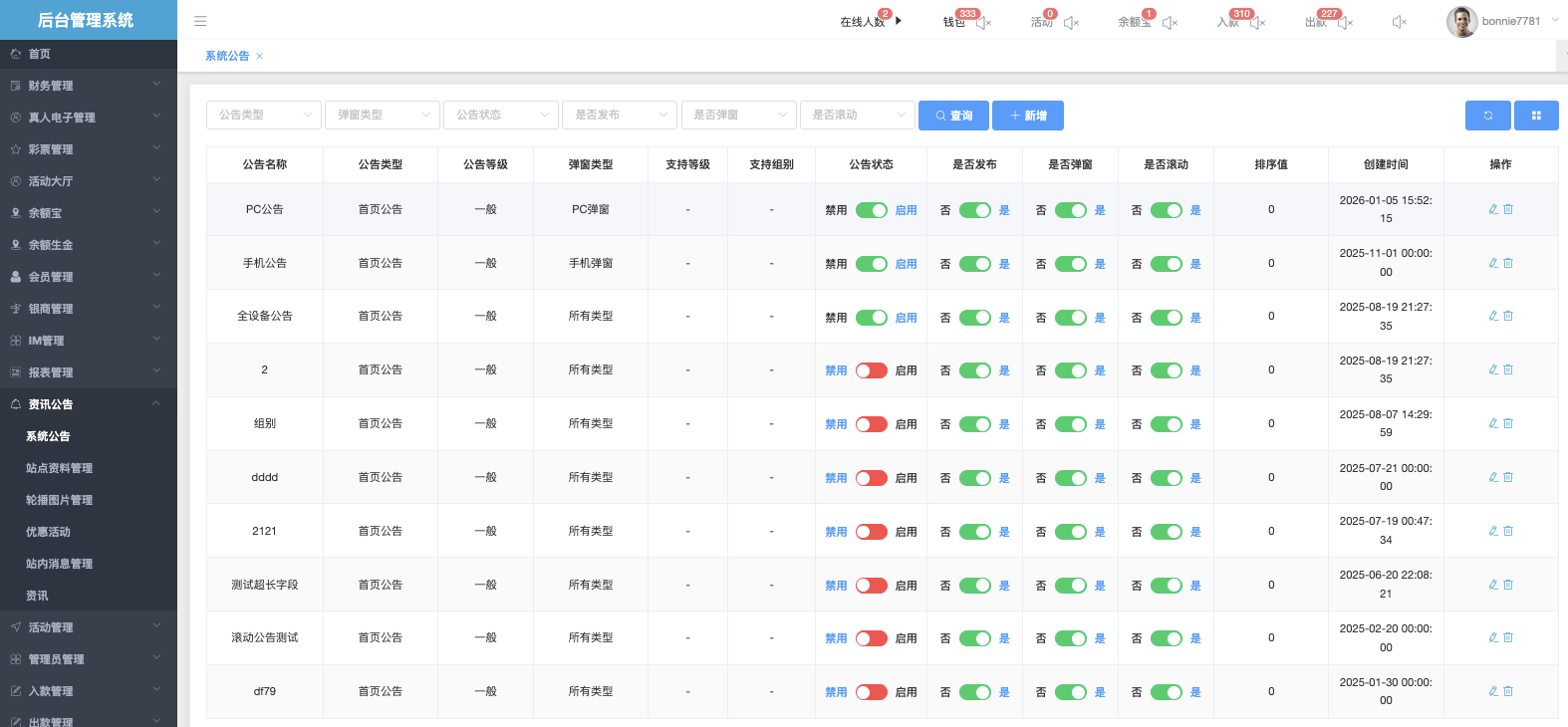 用于统一管理和发布平台内各类系统级公告。管理员可在此创建、编辑、启用/禁用、针对特定会员等级/分组定向推送公告