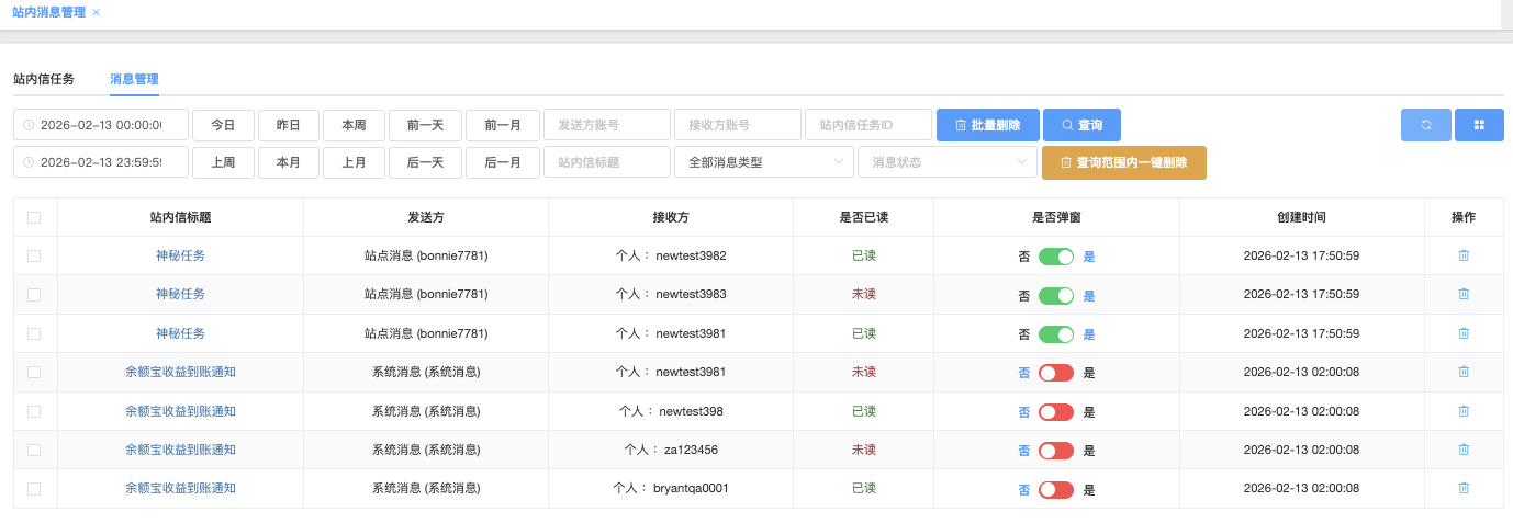 - 站内信标题:输入相关标题支持模糊查询(如 神秘)