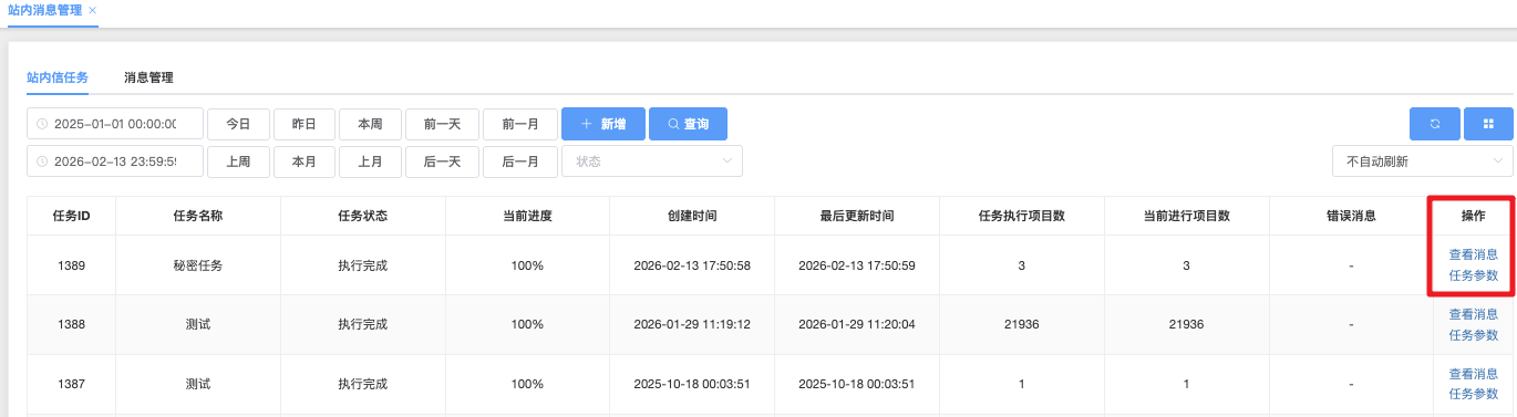 - 「查看消息」点击后跳转至「消息管理」,可查看该任务的执行进度与详细信息。