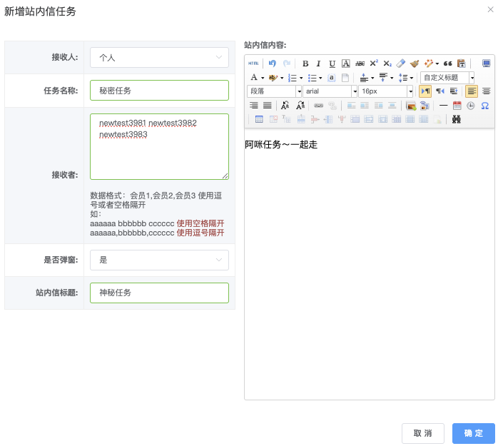 - 站内信内容:右侧文本编辑器,支持文字格式、插入图片/链接/列表等